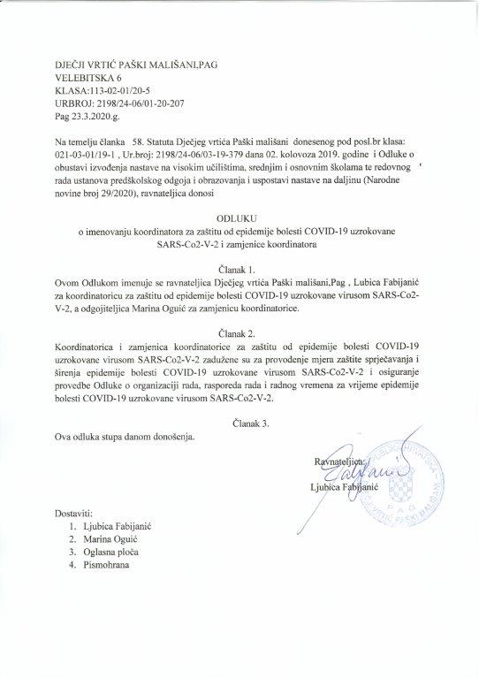- ODLUKA o imenovanju koordinatora za zaštitu od epidemijske bolesti COVID-19