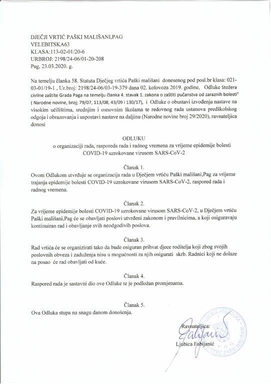 - ODLUKA o organizaciji rada,rasporeda rada i radnog vremena za vrijeme epidemijske bolesti COVID-19