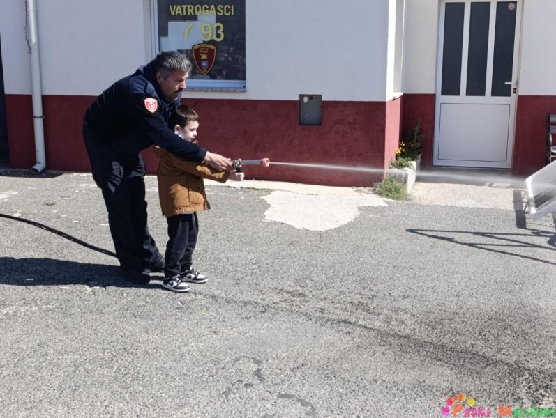 Drugog dana otvorenih vrata Dobrovoljnog vatrogasnog društva Pag, skupine Balončići i Tići imale su priliku doživjeti isto iskustvo kao i njihovi prijatelji u jučerašnjem posjetu. Vatrogasci su nas dovezli do svoje postrojbe u raznim vatrogasnim vozilima, a u dvorišnom prostoru ispred vatrogasnih garaža dočekali su nas vatrogasci. Vatrogasac Toni Sabalić i zamjenik zapovjednika David Ferčec prezentirali su djeci kako se koriste i čemu služi vatrogasna oprema s kojom izlaze na intervencije.