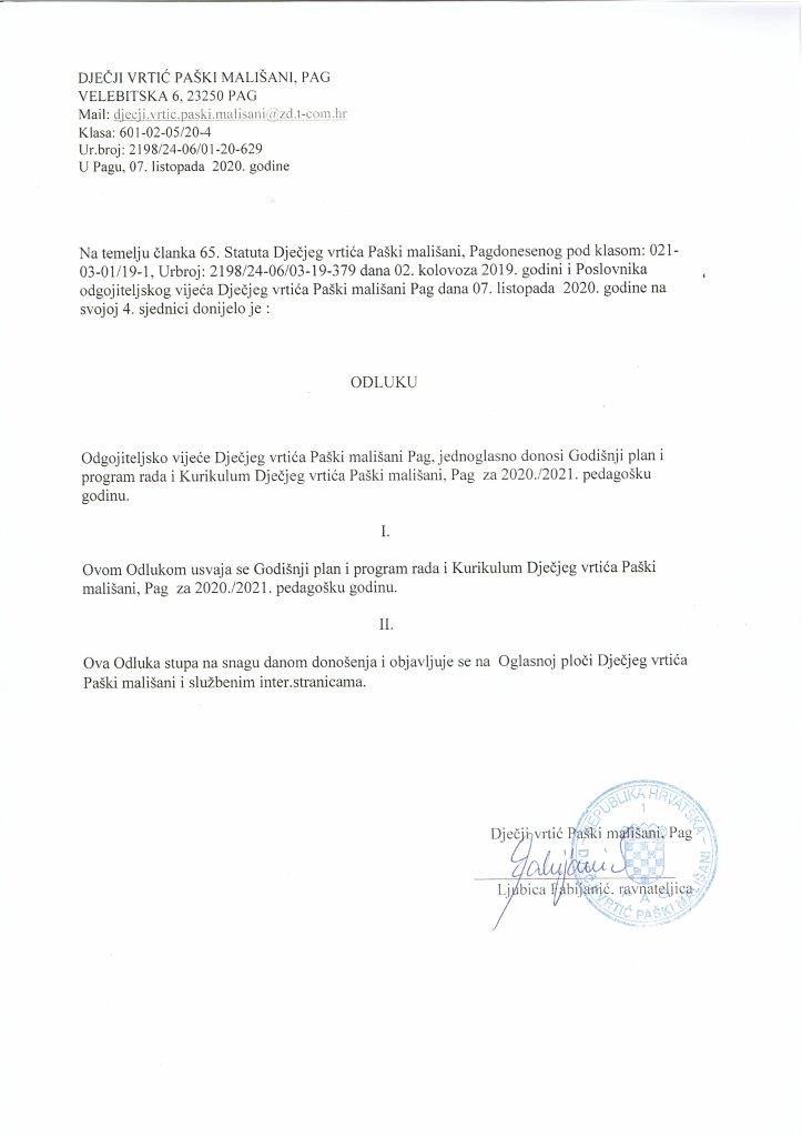 - Odluka o usvajanju Godišnjeg plana i programa rada i Kurikulum Dječjeg vrtića Paški mališani Pag za 2021._2022 pedagošku godinu - pogledaj