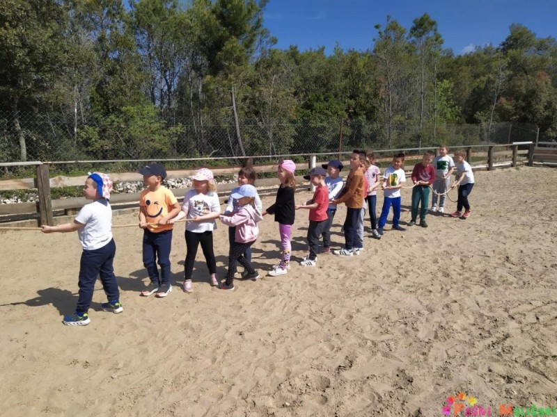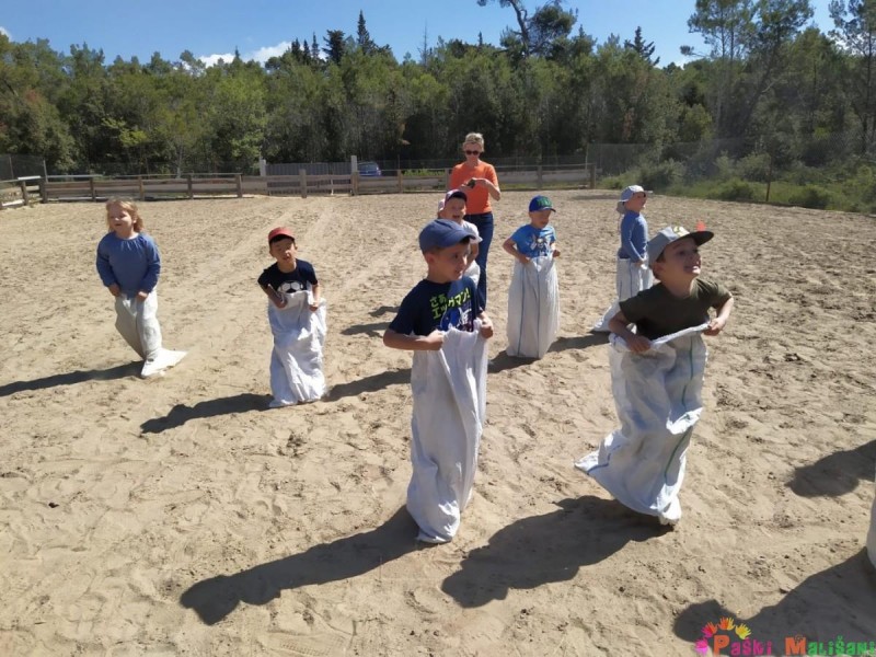 Kroz pjesmu i veselu atmosferu stigli smo u Zadar, a potom i na naše odredište u Kožinu gdje nas je dočekala voditeljica Ranča Idassa, gospođa Marijana sa bijelim ponijem Kanom. Za početak nam je gospođa Marijana održala edukaciju o konjima, prilikom čega smo naučili mnogo zanimljivih informacija i činjenica o konjima. Tako smo saznali da konj ima najveće oko od svih sisavaca, da mogu disati samo na nos, žive oko 30 godina, da se znoje kao i ljudi te da se isto tako mogu vrlo lako razboljeti. Naučili smo da su konji jako inteligentne i pametne životinje, ali također i jako plahe životinje koje se vrlo lako prestraše. Iz tog razloga, prije nego smo krenuli na jahanje, gospođa Marijana nam je pokazala kako se treba ponašati blizu konja, odnosno da im ne smijemo naglo prilaziti i biti jako glasni te mahati rukama ispred njih i ono najvažnije da ne smijemo prilaziti konju iza leđa. U ograđenom manježu dočekala su nas 3 konja, veliki tamnosmeđi Lehmi love, bijeli sportski pony Rock'n'roll i bijeli pony Kan. Svako dijete imalo je priliku jahati, a oni koji nisu htjeli mogli su konje pomaziti. Nakon jahanja konji su otišli na zasluženi odmor, a djeca su pojela voćni obrok. U tom trenutku su nam se pridružile 3 patuljaste koze, Oreo, Bajadera i Jaffa, koje su djeca nahranila korama od banana i koje su nam pravile društvo do odlaska sa ranča. Djelatnici ranča za nas su organizirali i natjecateljske igre poput povlačenja užeta, skakanja u vrećama i druge razne igre. Za kraj druženja zahvalili smo se djelatnicima ranča, pozdravili sa životinjama te uputili autobusom na povratak prema vrtiću gdje nas je čekao ručak i zasluženi poslijepodnevni odmor. Kako smo se proveli možete pogledati u galeriji slika u nastavku.