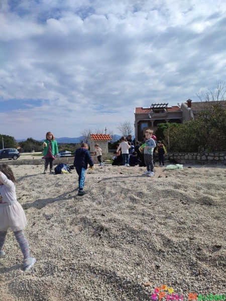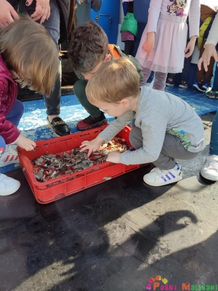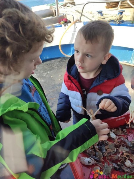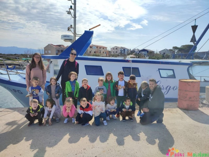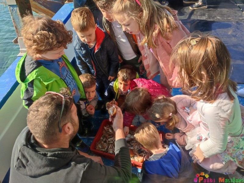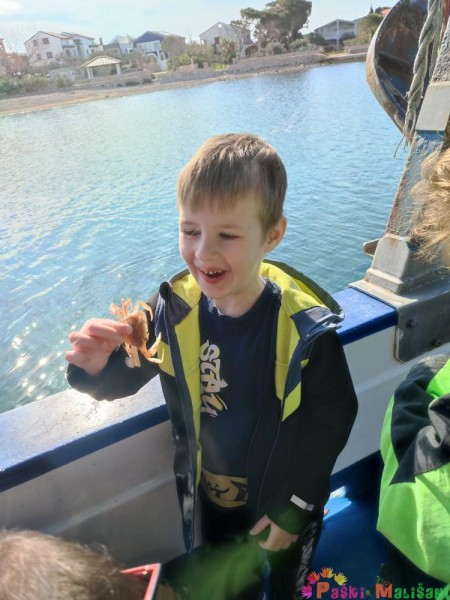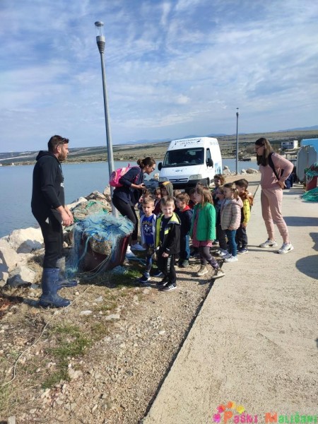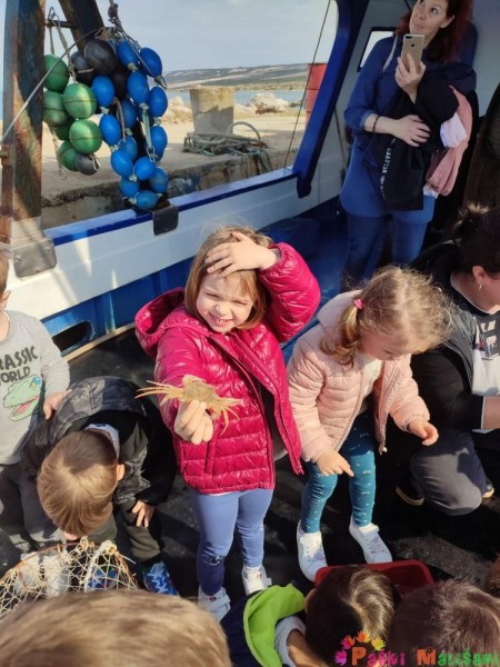 Pokazali su nam brodsku opremu te opremu za ribolov. Nakon toga djeca su imala priliku promatrati i uzeti u ruku školjke, račiće i ribice koje su zalutale u mrežu, a naposlijetku su njima napunili vršu koju su bacili u more.