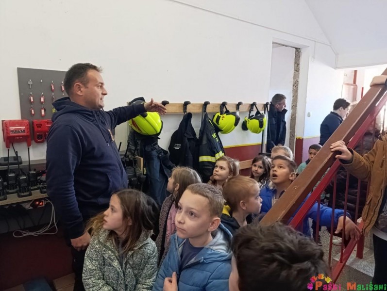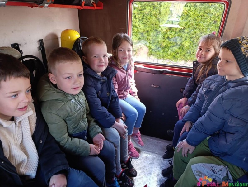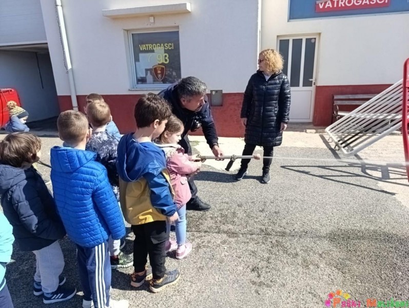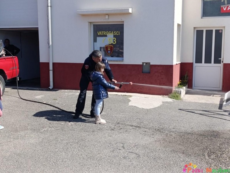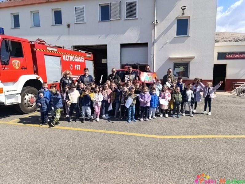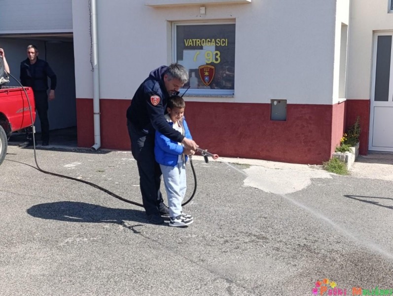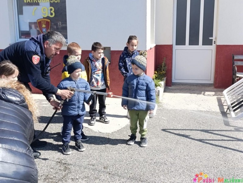 Drugog dana otvorenih vrata Dobrovoljnog vatrogasnog društva Pag, skupine Balončići i Tići imale su priliku doživjeti isto iskustvo kao i njihovi prijatelji u jučerašnjem posjetu. Vatrogasci su nas dovezli do svoje postrojbe u raznim vatrogasnim vozilima, a u dvorišnom prostoru ispred vatrogasnih garaža dočekali su nas vatrogasci. Vatrogasac Toni Sabalić i zamjenik zapovjednika David Ferčec prezentirali su djeci kako se koriste i čemu služi vatrogasna oprema s kojom izlaze na intervencije.