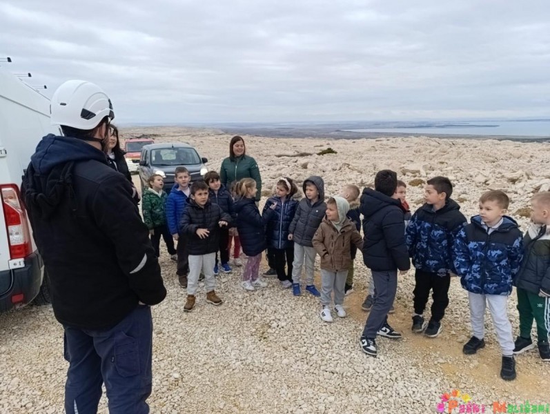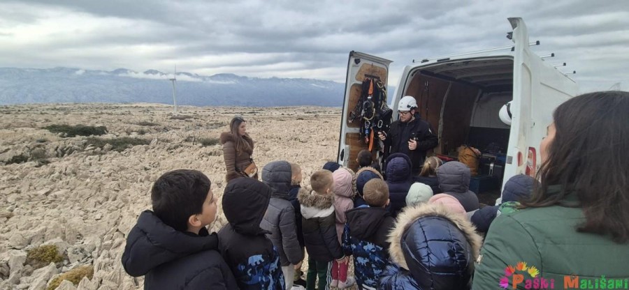 U suradnji s našim vrijednim vatrogascima, koji su se pobrinuli za siguran prijevoz do vrha, stigli smo do mjesta gdje nas su nas dočekali Domagoj i Ante, tehničari za održavanje vjetroelektrane. Oni su nam strpljivo objasnili kako izgleda održavanje vjetrenjača i zašto su one važne za proizvodnju energije.